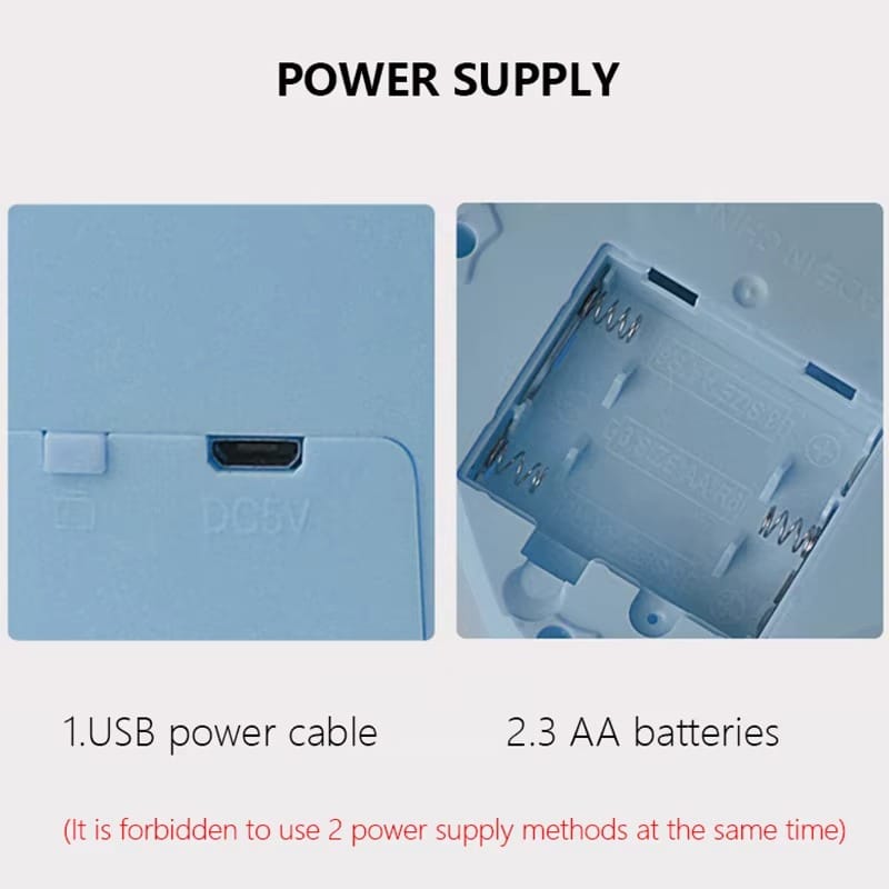 Power supply mode: can use three AA batteries (not included) or USB cable power supply (the two methods cannot be used at the same time)